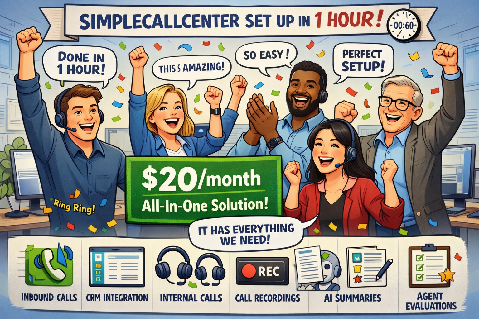 SimpleCallCenter includes call handling, infrastructure, and usage in one simple plan, so there are no hidden operational costs.