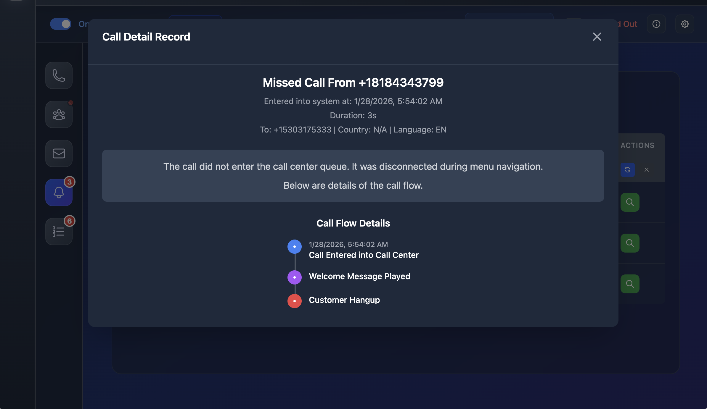- Full call flow timeline (IVR, welcome message, hang-up)
