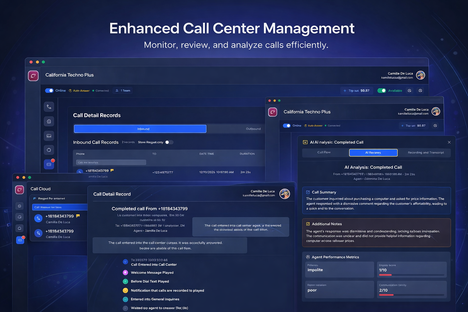 - •Coach agents live — supervisors can listen, whisper, or join any call in real time.