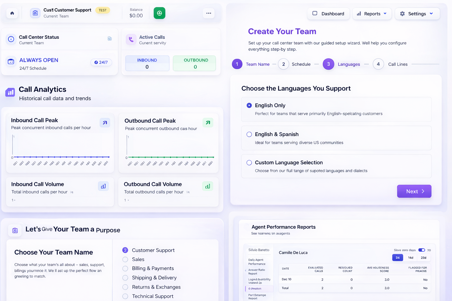 - •Add agents in minutes, not days — no desk phones or IT setup needed.